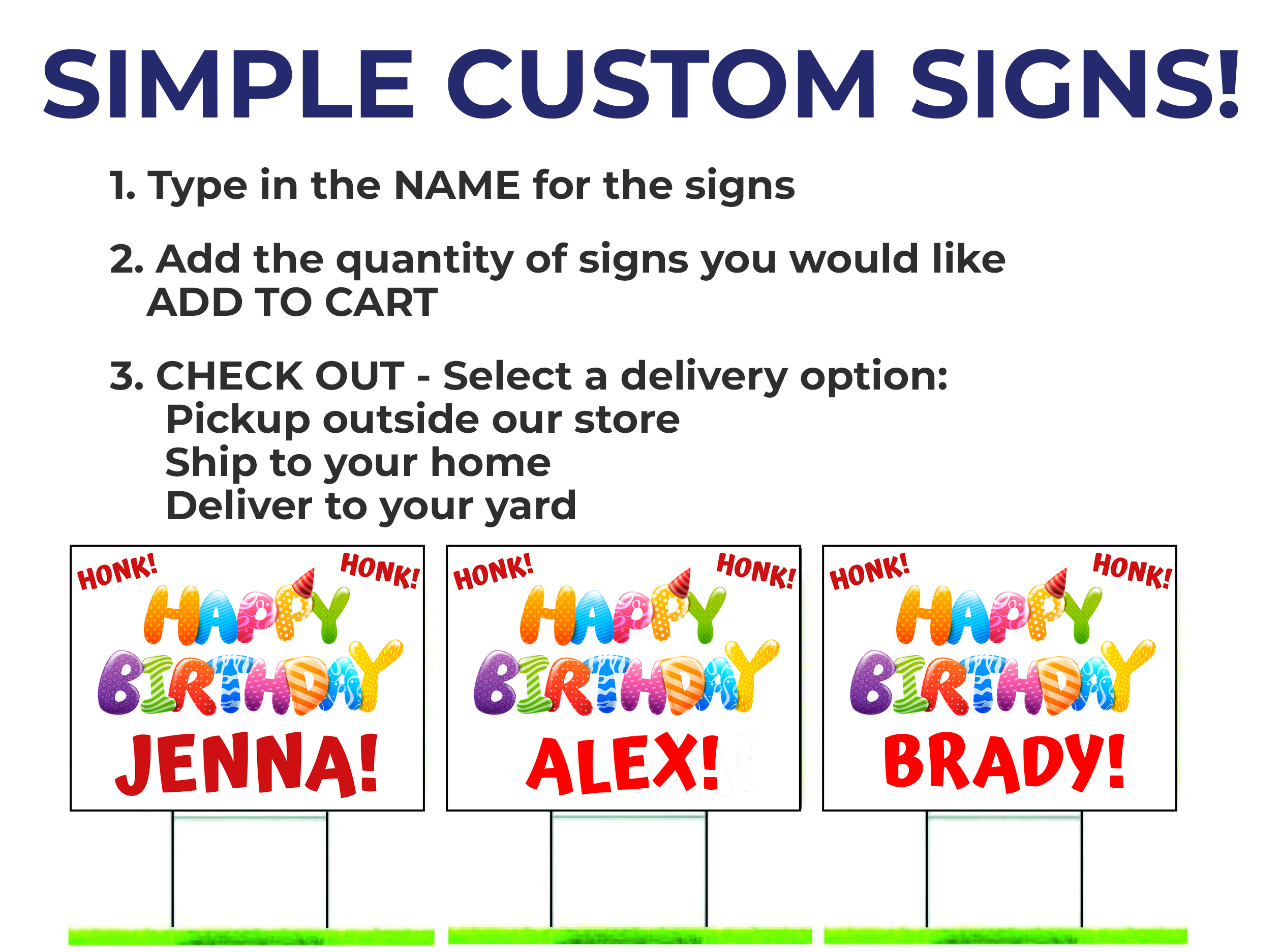 18" x 24" - CUSTOM 2 side yard signs (printed on both sides) - Wire H Stake Included! We'll automatically create a sign with your name for you. PLEASE MAKE SURE YOU SPELL THE NAME CORRECTLY IN THE TEXT BOX! The sign will be printed with that exact name. Note: ARTWORK must be the same for each sign per order. If you order 3 signs, all 3 will have the EXACT same artwork printed on them. If you need more than 1 name for multiple birthdays, please add a separate product to cart.